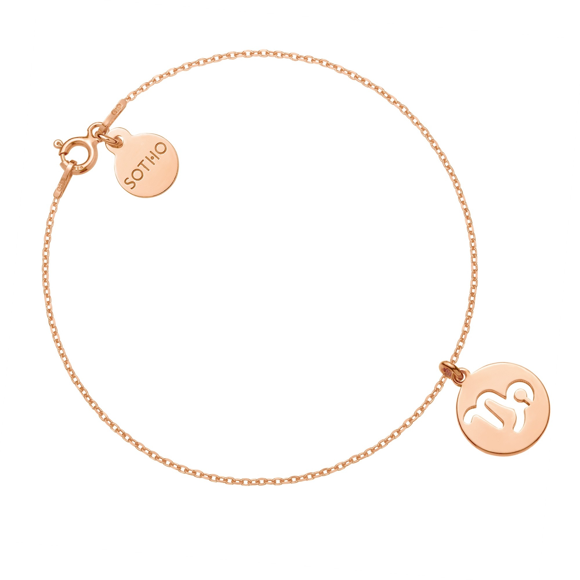 Złota bransoletka łańcuszkowa zdobiona znakiem zodiaku Koziorożca i zawieszką z logo marki. Całość wykonana ze srebra 925 powlekanego 24 karatowym różowym złotem.