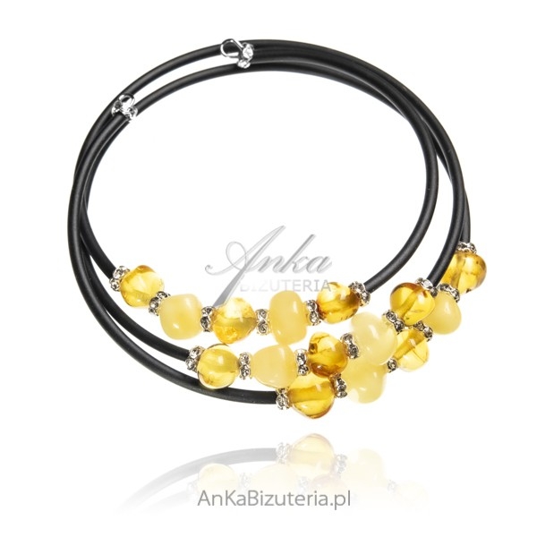 Bransoletka z żółtym bursztynem i cyrkoniamii na czarnej kauczukowej sprężynce