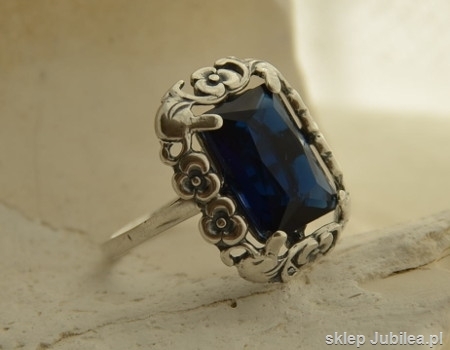 Bardzo elegancki, srebrna pierścień, w którego secesyjną, srebrną oprawę oprawiono piekny szafir (synt) o wymiarach 10x14mm.