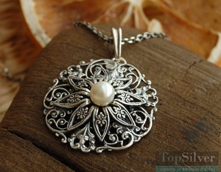 Misterny srebrny wisiorek złożony z dwóch ażurowych elementów, uwieńczeniem których jest perła (syntetyczna).