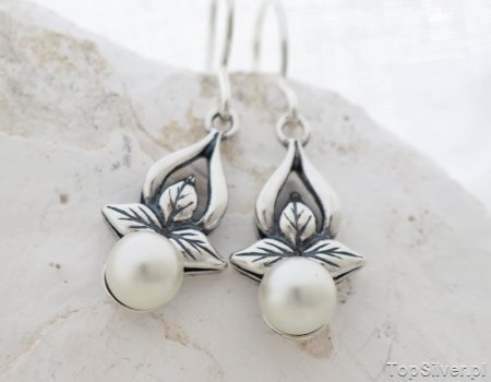 Srebrne kolczyki przedstawiające roslinną gałązkę, której uwieńczeniem jest owoc w postaci perełki.