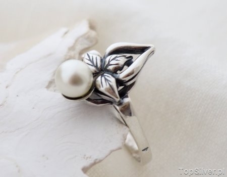 Srebrny pierścionek, przedstawiający roslinną gałązkę, której uwieńczeniem jest owoc w postaci perełki.