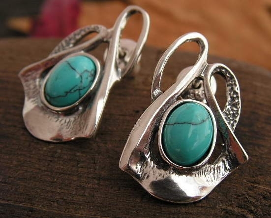 Srebrne kolczyki o bardzo interesującym i eleganckim wzornictwie. W centrum każdego ogniwa wkomponowany został turkus o wymiarach 6x8mm (syntetyczny).