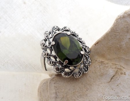 Przedstawiamy srebrny pierścień w którego centralnym miejscu zakuty został oliwin (synt). Kamień pięknie połyskuje przyciagając uwagę.