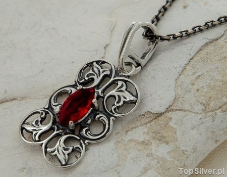 Wytworny, srebrny wisiorek  stylistyką nawiązujący do najpiękniejszego okresu dla jubilerstwa czyli secesji. W oksydowane, roślinne zdobienia wkomponowano pięknie wybarwiony rubin (synt). Biżuteria z  pewnością będzie przykuwać uwagę i sprawi, iż każdy poczuję się w niej piękniejszy.