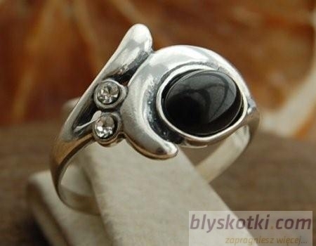 Niepowtarzalny, srebrny pierścionek – stylistyką nawiązujący do okresu art deco. W piękne kształty wkomponowano onyks oraz 2 kryształki Swarovskiego. Biżuteria wykonana została z dbałością o każdy szczegół.