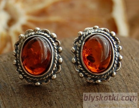 Wytworne, srebrne, oksydowane kolczyki, w których niezwykle delikatny wzór wkomponowano piękny bałtycki bursztyn, o koniakowym zabarwieniu.