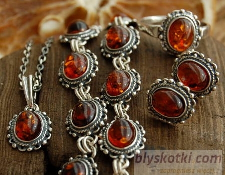 Wytworny zestaw srebrnej biżuterii, oksydowane elementy, w których niezwykle delikatny ażurowy wzór wkomponowano piękny bałtycki bursztyn o koniakowym zabarwieniu.