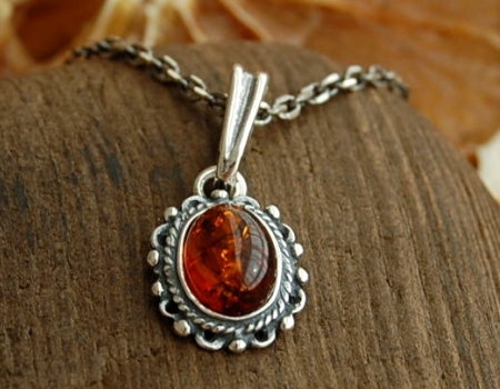 Wytworny, srebrny oksydowany wisiorek, w którego niezwykle delikatny ażurowy wzór wkomponowano piękny bałtycki bursztyn o koniakowym zabarwieniu.