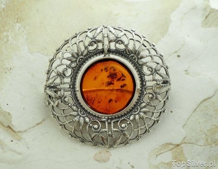 Przedstawiamy Państwu srebrną ażurową broszkę, której powstanie zainspirowane było dziełami malarstwa włoskiego renesansu. Tam spotykane wykończenia fresków, przyczyniły się bezpośrednio do powstania srebrnej dekoracji broszki. A żeby całości dodać jeszcze trochę tajemniczości to zdecydowaliśmy się w środku podwiesić piękny, naturalny, bursztyn – oprawiony w srebrnej ramce. Wiszący luźno kamień z całą pewnością będzie przyciągać spojrzenia. Bursztyn zaczepiony jest w taki sposób, aby łatwo można byłoby go zdjąć. Dzięki czemu mamy zupełnie nową broszkę 🙂