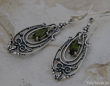 Przedstawiamy Państwu, piękne, ażurowe, srebrne kolczyki w których dekoracyjnym kształcie podwieszono oliwin zakuty w srebrną ramkę. Kształt kolczyków to nawiązanie do biżuterii orientalnej, na taką biżuterię powraca moda i co najciekawsze, największą popularnością cieszy się wśród najmłodszych wielbicielek srebrnej biżuterii. Dlatego jeśli poszukujesz prezentu sądzimy że ten model idealnie trafia w gust osób nieco młodszych.