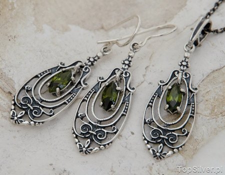 Przedstawiamy Państwu, piękny, ażurowy, srebrny komplet w składzie kolczyki i wisiorek. W którego dekoracyjnych kształtach podwieszono oliwin zakuty w srebrną ramkę. Kształt srebrnej biżuterii, to nawiązanie do orientu, na taką biżuterię powraca moda i co najciekawsze, największą popularnością cieszy się wśród najmłodszych wielbicielek biżuterii. Dlatego jeśli poszukujesz prezentu sądzimy że ten model idealnie trafia w gust osób nieco młodszych.