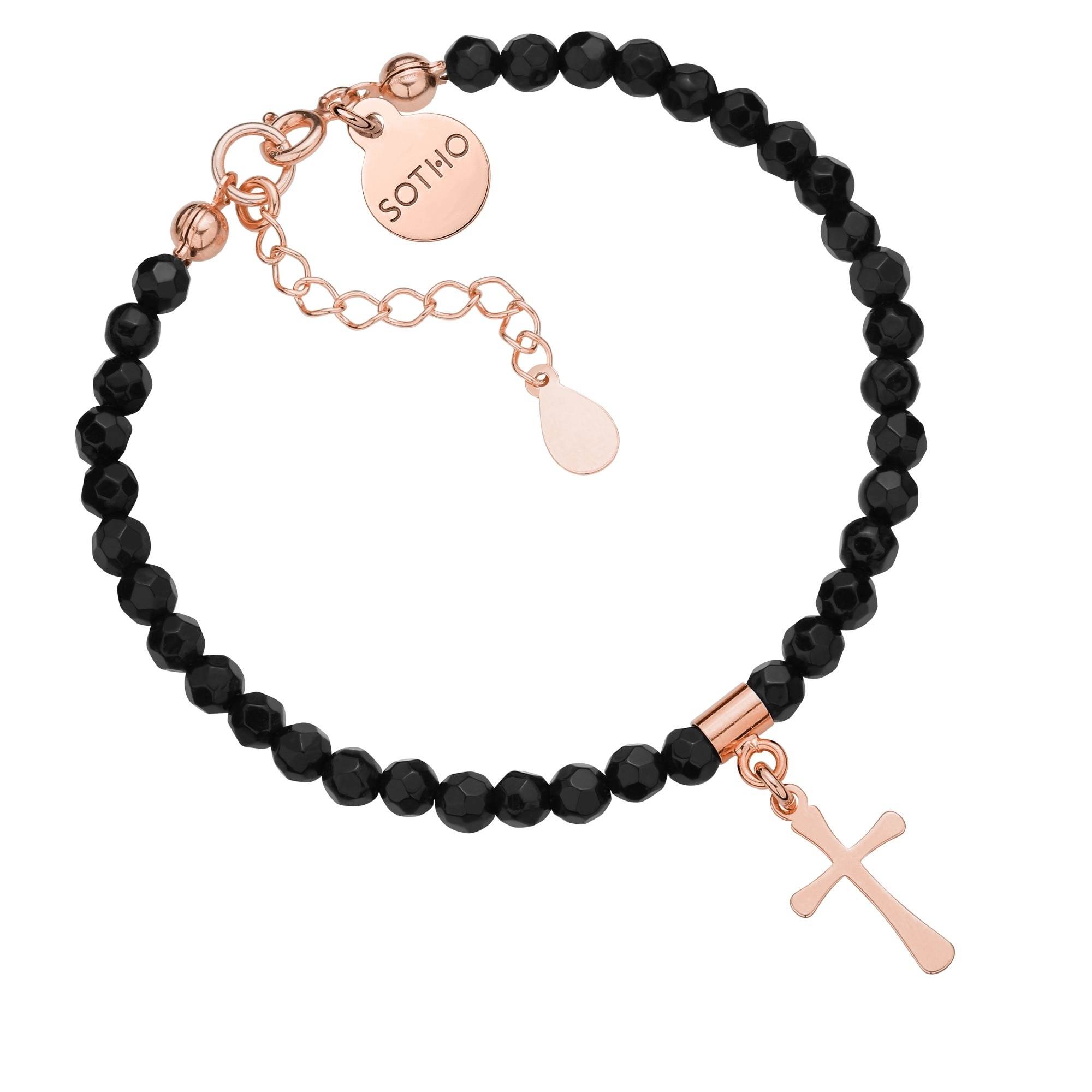 Bransoletka wykonana z czarnego fasetowanego onyksu, zdobiona złotym krzyżykiem i zawieszką z logo marki. Bransoletka posiada łańcuszek regulacyjny. Wszystkie elementy wykonane ze srebra 925 powlekanego 24 karatowym różowym złotem.