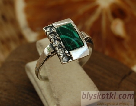 W pierścionku umiejętnie połaczono malachit syntetyczny oraz pięć połyskujących cyrkonii.