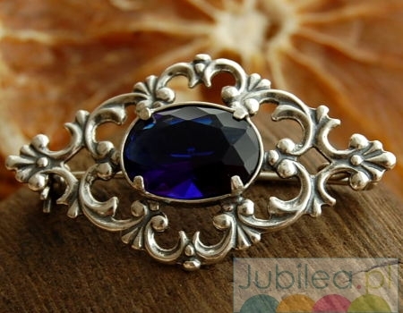 Stylowa brosza, która swój piękny wzór zawdzięcza rozkwitowi jubilerstwa w carskiej Rosji. W niepowtarzalny ornament wkomponowany jest ogromny szafir (synt).