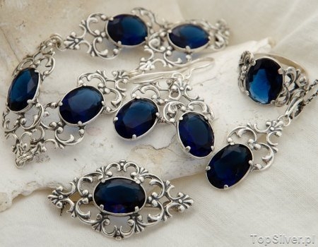 Stylowy zestaw biżuterii, który swój piękny wzór zawdzięcza rozkwitowi jubilerstwa w carskiej Rosji. W niepowtarzalny ornament wkomponowany jest ogromny szafir (synt).