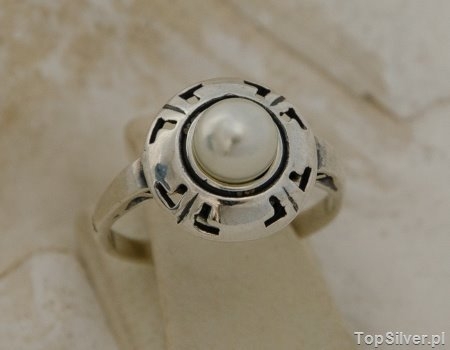 Przedstawiamy elegancki srebrny pierscionek, którego stylistyka to nawiązanie do greckich meandrów, Przyozdabiają one obwolutę w środku której umieszczono perłę o średnicy 6mm.