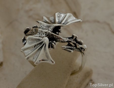 Stylowy, srebrny i bardzo oryginalny pierścień, przedstawiający dragona z rozpiętymi skrzydłami.