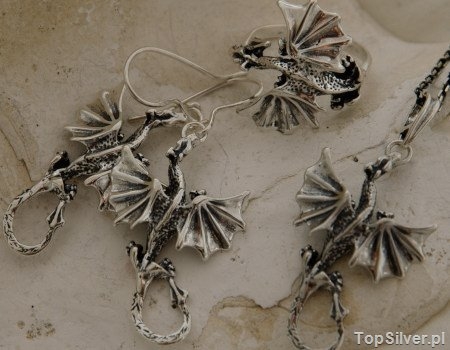 Stylowy, srebrny komplet (kolczyki, wisior oraz pierścień), przedstawiający smoki z rozpiętymi skrzydłami. Oksyda podkreśla mistrzowskie wykonanie biżuterii.
