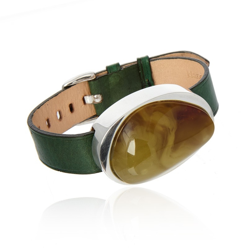 kamienie: zielono-koniakowy bursztyn 4,5 cm/3 cmwielkość bransoletki: – zapięcie od 15 cm – 20 cm/ szerokość paska 1,1 cmbransoletka – pasek ręcznie robiona i farbowana w polskiej pracowni – zielony kolor paska