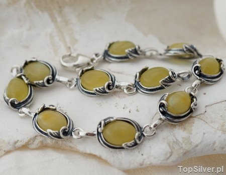 Srebrna bransoleta z naturalnymi bursztynami. Każdy kamień zamknięty jest w srebrnej oksydowanej oprawie, ozdobionej dwoma listkami. Ogniwa bransoletki są lutowane, dzięki czemu można mieć pewność w codziennym użytkowaniu, że jej nie zgubimy.