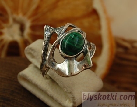 W centrum motywu zdobniczego pierścionka wkomponowany został pięknie wybarwiony malachit syntetyczny.