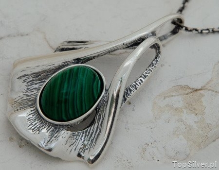 Gustowny srebrny wisior , w którego motyw zdobniczy wkomponowany został spory malachit (synt).