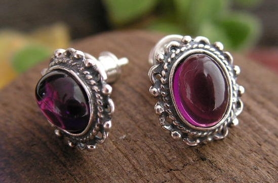 Wytworne, srebrne, oksydowane kolczyki, w których niezwykle delikatny wzór wkomponowano piękny ametyst o ciemnym fioletowym wybarwieniu.