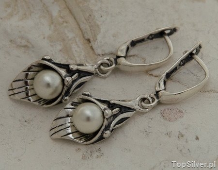 Secesyjna biżuteria to przede wszystkim nawiązanie do motywów roślinnych, nieregularnej kreski, symetrycznych kształtów no i przede wszystkim do kamieni. W przedstawianym modelu mamy wszystko co jest najlepsze w biżuterii secesyjnej. Srebrne, oksydowane kolczyki w których motyw zdobniczy przedstawiający piękną lilię wkomponowana została perła (synt).