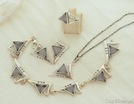 Piękny srebrny zestaw, posiadający orginalne i niepowtarzalne wzronictwo przykuję uwagę każdego i sprawi, że poczujesz się jeszcze piękniejsza. W centralnym miejscu każdego elementu wkomponowany został trójkątny kamień nazywany kocim okiem(wymiary boku to 1cm).