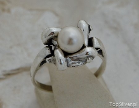Elegancki srebrny pierścionek w centralnym miejscu którego umieszczono perłę.