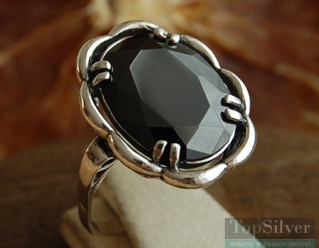 Bardzo elegancki, srebrny pierścionek, w którego delikatną srebrną oprawę zakuto okazały fasetkowany onyks.