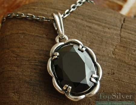 Bardzo elegancki, srebrny wisiorek, w którego delikatną srebrną oprawę zakuto okazały fasetkowany onyks.