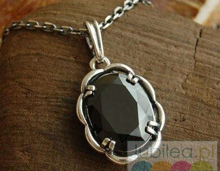 Bardzo elegancki, srebrny wisiorek, w którego delikatną srebrną oprawę zakuto okazały fasetkowany onyks.