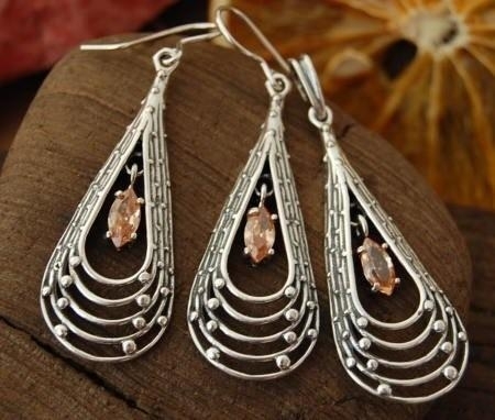 Misterny srebrny zestaw biżuterii: kolczyki i wisior, w którego ażurowej, oksydowanej oprawie został wkomponowano piękne topazy złociste.