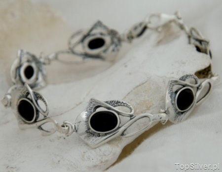 Srebrna bransoleta o bardzo interesującym i eleganckim wzornictwie. W centrum każdego ogniwa wkomponowany został onyks o wymiarach 6x8mm.