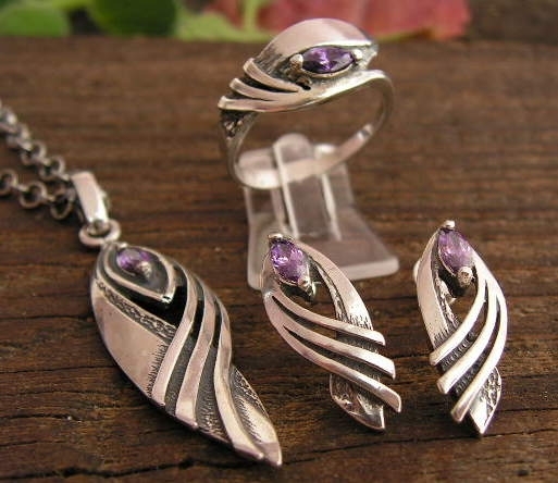 Komplet w skład którego wchodzą: kolczyki, pierścionek oraz wisiorek.