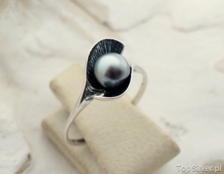 Delikatny, srebrny pierścionek, kształtem przypominający perłową muszlę w centrum, której znajduje się grafitowa – czarna perła (synt)
