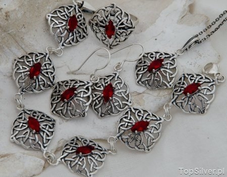 Piękny, srebrny zestaw biżuterii: kolczyki, bransoletka, wisiorek i pierścionek, w których pleciony motyw zdobniczy zakuty został piękny rubin (synt).
