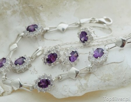 Przedstawiamy Państwu, elegancki srebrny zestaw biżuterii ( w składzie: bransoletka, kolczyki, wisiorek oraz pierścionek), w centralnym miejscu elementu zdobniczego biżuterii połyskuje ametyst(synt), a wokół niego zakutych jest kilkanaście drobnych cyrkonii. Ten klasyczny model biżuterii przypadnie do gustu zarówno młodszym jak i starszym wielbicielką błyskotek. Dlatego naszym zdaniem ten model idealnie nadaje się na prezent. Dobrze wyważony balans kolorów oraz połysk, sprawią że nikt nie przejdzie obojętnie wokół takiej biżuterii.