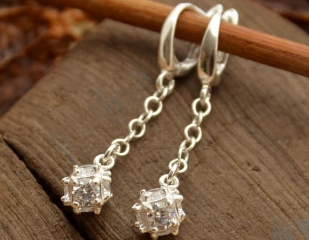 Niezwykle ciekawe, srebrne kolczyki z podczepionym sześcianem w którym to zakuto po jednej cyrkonii w każdej ścianie. Element przymocowany jest do łańcuszka, do którego zakończenia przymocowano bigiel z zatrzaskiem.