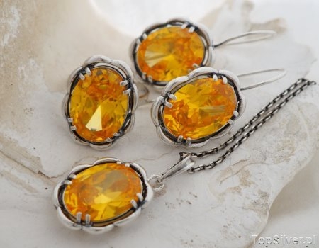 Połączenie cytrynu złocistego oraz srebra to para która przebojem wdarła się do klasyków biżuterii. Piękny złocisty kolor kamienia w połączeniu z połyskującym na biało srebrem to kompozycja, która wprawi w zachwyt każdą miłośniczkę błyskotek 🙂 W tym miejscu przedstawiamy elegancki, srebrny zestaw biżuterii (w składzie: kolczyki, wisior oraz pierścień), w którego dyskretnych oprawach zakuto okazałe, fasetowane cytryny złociste (synt).