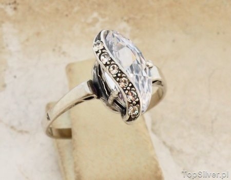 Stylowy, srebrny pierścionek, który swoją stylistyką nawiązują do biżuterii z początku ubiegłego wieku produkowanej w Wiedniu. Motyw zdobniczy symbolicznie przedstawia owoc, który został przeslonięty srebrna gałązką w której umieszczono 6drobnych kryształków Swarovskiego.