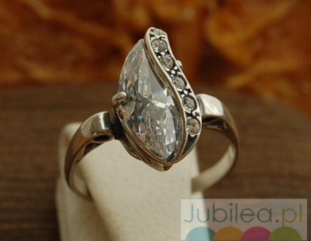 Stylowy, srebrny pierścionek, który swoją stylistyką nawiązują do biżuterii z początku ubiegłego wieku produkowanej w Wiedniu. Motyw zdobniczy symbolicznie przedstawia owoc, który został przeslonięty srebrna gałązką w której umieszczono 6drobnych kryształków Swarovskiego.