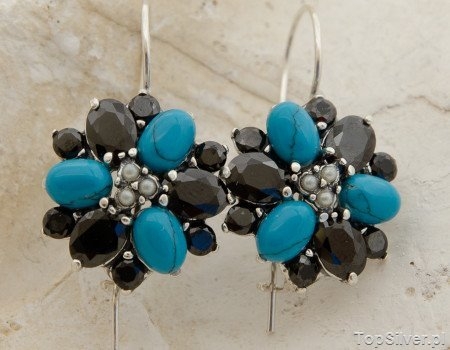 Królewskie srebrne kolczyki, które łączą w sobie piękno biżuterii secesyjnej oraz blask szlachetnych kamieni i pereł. W zdobniczy ornament artysta wkomponował 6okraglych onyksów(srednica 3mm), 3owalne turkusy – synt. (5x7mm), 3onyksy – synt (5x7mm) a dzieło uwieńczył 3 malutkimi perełkami. Kolczyki są niezwykłej urody!