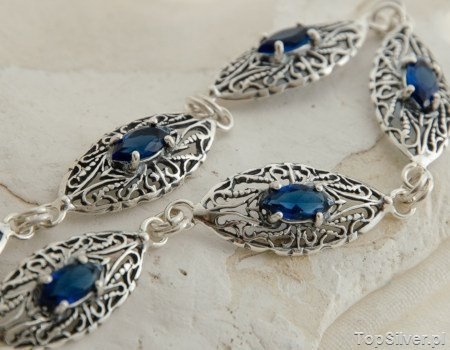 Wytworna, srebrna bransoletka stylistyką nawiązująca do najpiękniejszego okresu dla jubilerstwa czyli secesji. W misterny a zarazem delikatny wzór wkomponowano pięknie wybarwione szafiry(synt).