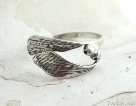 Srebrny, oksydowany pierścionek, przedstawiajacy gałązkę jemioły wraz z małymi, kulistymi owocami. Biżuteria prezentuje się nadzwyczaj realistycznie co może przyczyni się do uśmiechu losu w postaci większej dawki sczęścia 😉