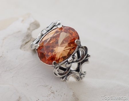 Stylowy pierścień, który swój piękny wzór zawdzięcza rozkwitowi jubilerstwa w carskiej Rosji. W niepowtarzalny ornament wkomponowany jest ogromny topaz złocisty (syntetyczny).