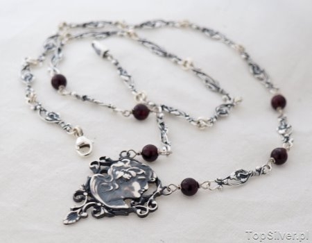 Piękny naszyjnik, którego uwieńczeniem jest stylowa kamea. Artysta w naszyjniku zdołał umieścić 6 naturalnych, okrągłych kulek granatu poprzedzielanych ogniwami z roślinnym motywem zdobniczym.