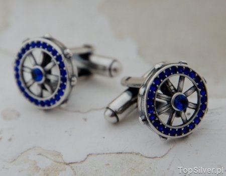 Spinki do koszuli w stylu marynarskim nie koniecznie dedykowane są tylko kapitanom okrętów. Jeśli lubisz sporty wodne, nie brak Ci fantazji no i chcesz aby Twoje mankietówki przykuwały uwagę to właśnie te spinki są dla Ciebie. Koło sterowe wokół którego obsadzone zostały szafiry (synt) oraz jeden nieco większy w centralnym miejscu to motyw przewodni spinek. Wykonane w całości ze srebra próby 925. Lekko pooksydowane.
